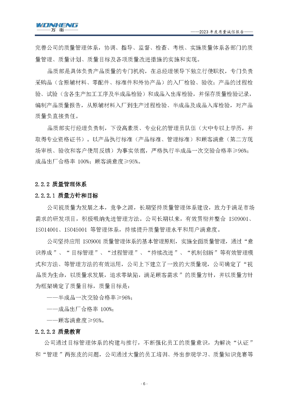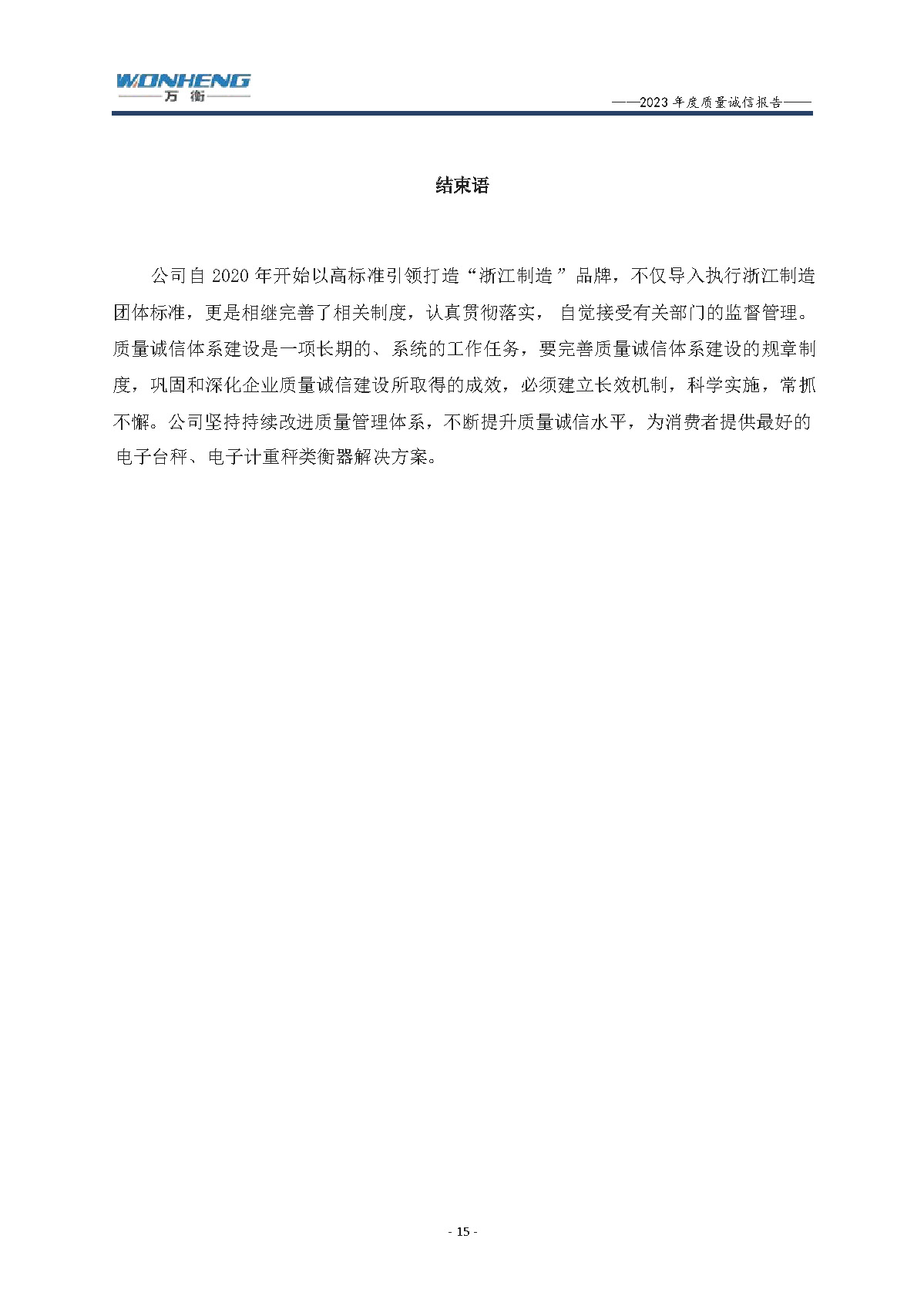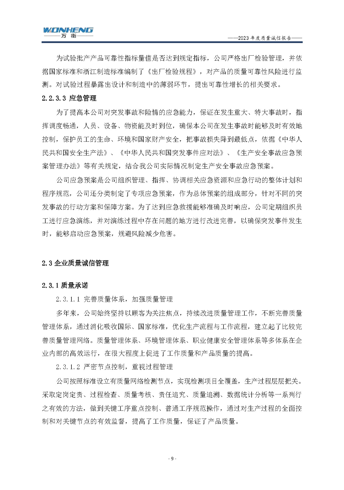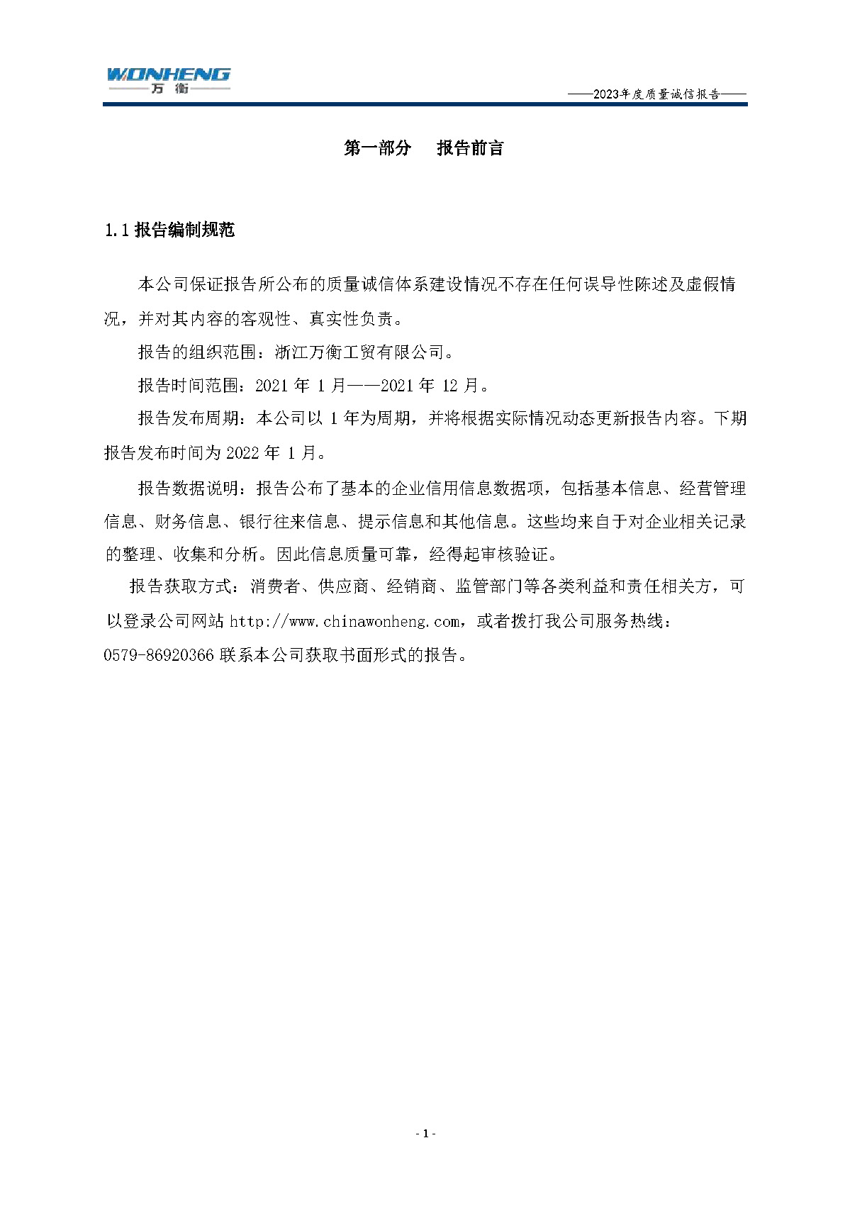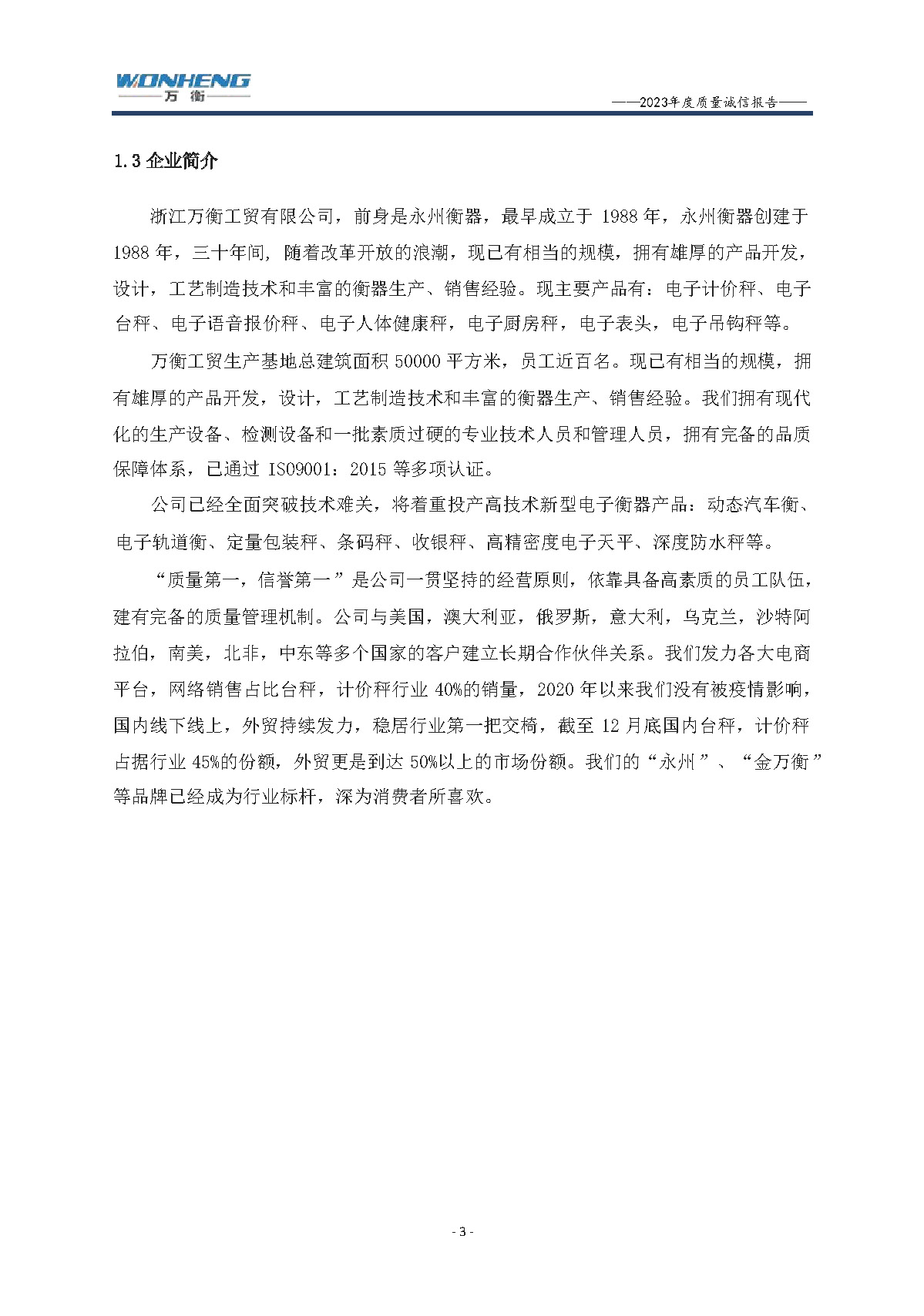 浙江萬衡工貿有限公司2023年度質量誠信報告